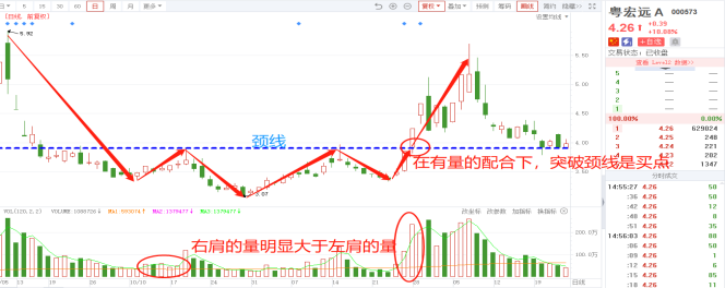 对头肩底的研判重点是成交量和颈线,成交量要处于温和放大状态,右肩的量要明显大于左肩的量。