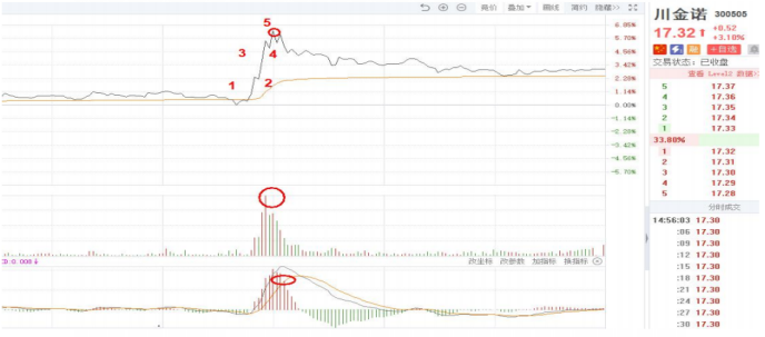 图例:这是2024年12月2日川金诺的分时图,走出5浪上攻走势,但是在形成第3浪出现明显爆量,但5 浪中量能明显不足,且macd红柱体也开始不能迹象放大,反而开始萎缩,说明了这是上冲无力的迹象。