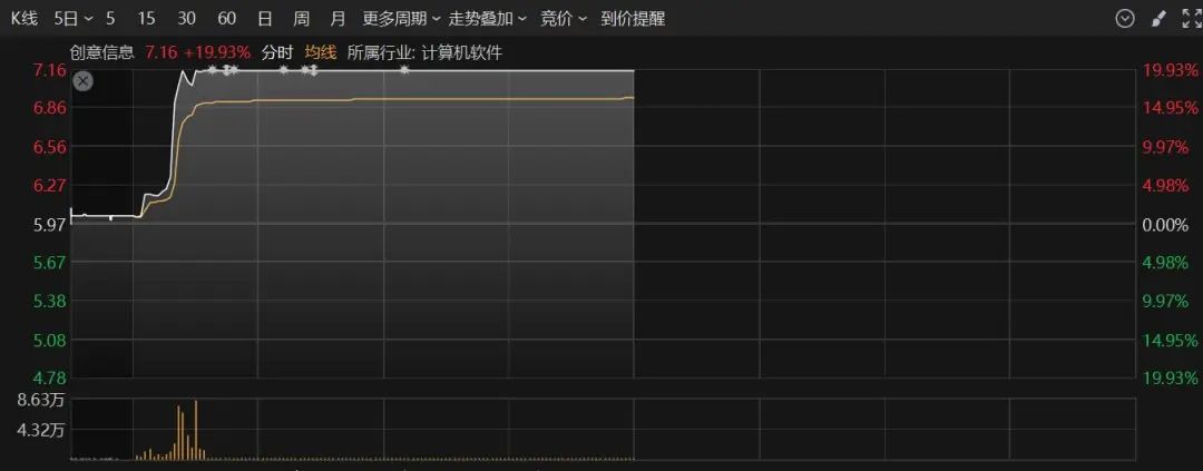 人工智能概念早间全线走强,智谱AI方向领涨,板块指数盘初一度放量直线拉升涨近4%,半日成交接近昨日全天成交。创意信息开盘仅约10分钟就垂直20%涨停,常山北明、正和生态同样在短时间内直线涨停。