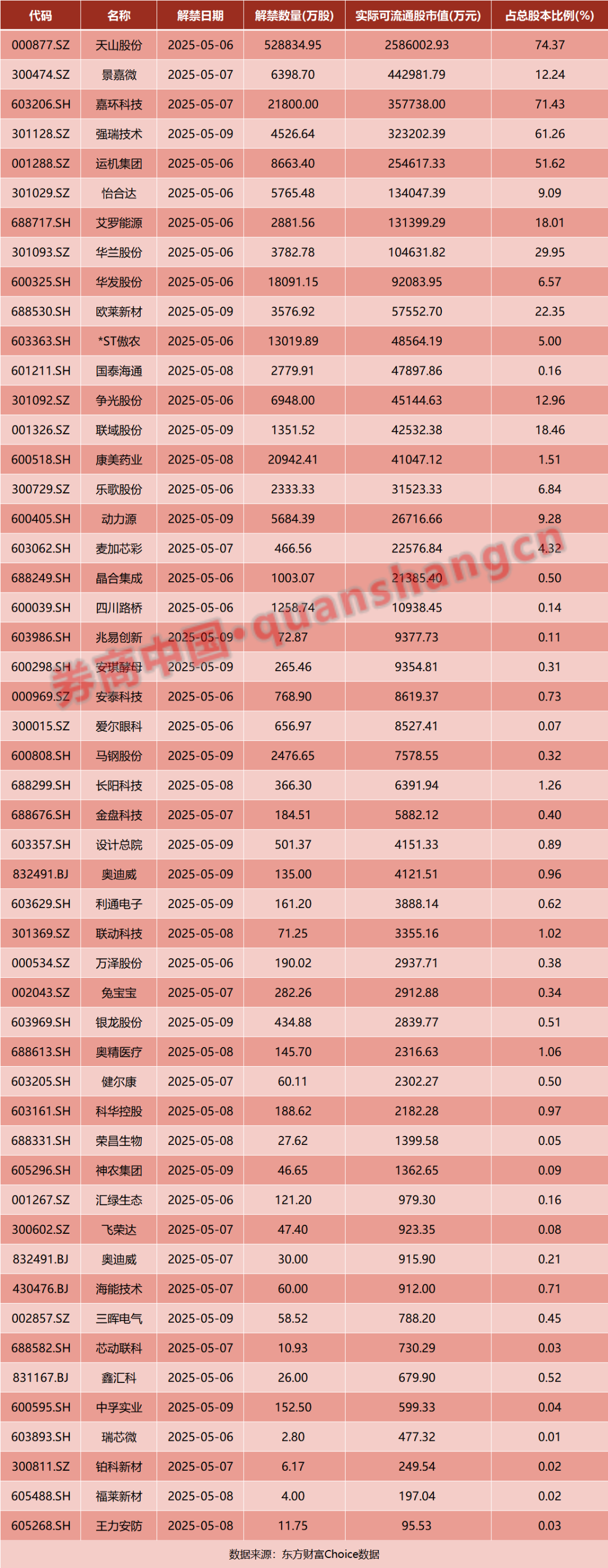 从解禁市值来看,解禁市值居前三位的是:天山股份(258.60亿元)、景嘉微(44.30亿元)、嘉环科技(35.77亿元)。