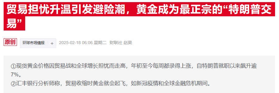 分析认为,短期来看,美国总统特朗普激进的关税议程引发了外界对经济增长可能受到打击的担忧,损害了市场对风险资产的需求,导致美股标普500指数进入修正阶段,帮助资金流入黄金资产。