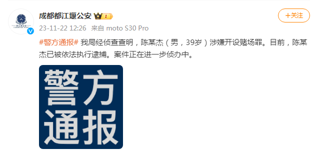 在斗鱼发布公告后,成都警方也在次日表态,透露陈少杰是涉嫌开设赌场罪被抓的。