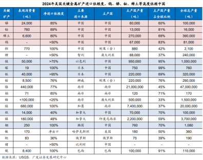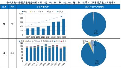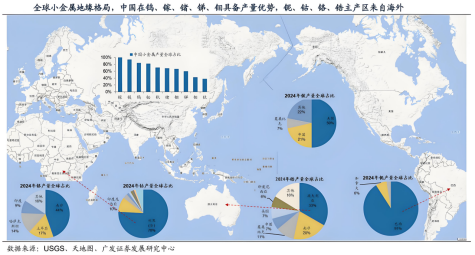 小金属:未来关键资源,中国钨、铋、镓、锗、锑、钼等小金属产量占比全球领先。小金属广泛应用于新兴产业,长期战略意义日益提升,各国将大多数小金属列为关键矿产。