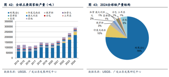 钴:刚果(金)限钴出口,有望快速提振钴价,钴价长期下行趋势有望反转(华友钴业、力勤资源、腾远钴业、洛阳钼业等)。据iFinD,2024年全球钴产量为29万吨,其中刚果(金)钴产量22万吨,占比约76%,若刚果(金)限制钴出口4个月,预期影响钴供给约7.3万吨。长期来看,本轮出口管制表明资源国较强的挺价能力及意愿,随着需求长期稳步提升,叠加主产国出口约束机制建立,钴价长期下行趋势有望反转。