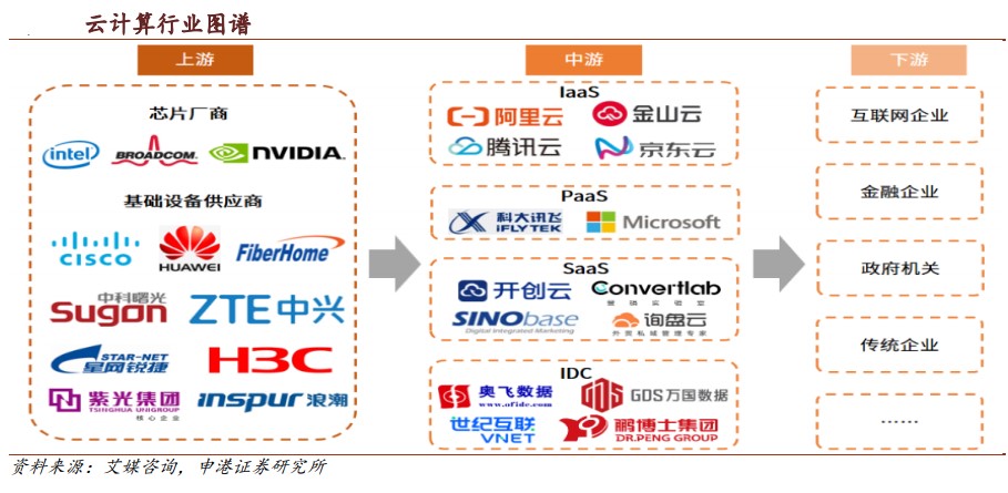 从产业链来看,云计算上游主要为基础设施供应商,提供各类服务器、网络、存储等硬件设备,下游主要为政府、企业、个人等消费终端。