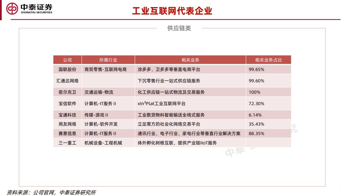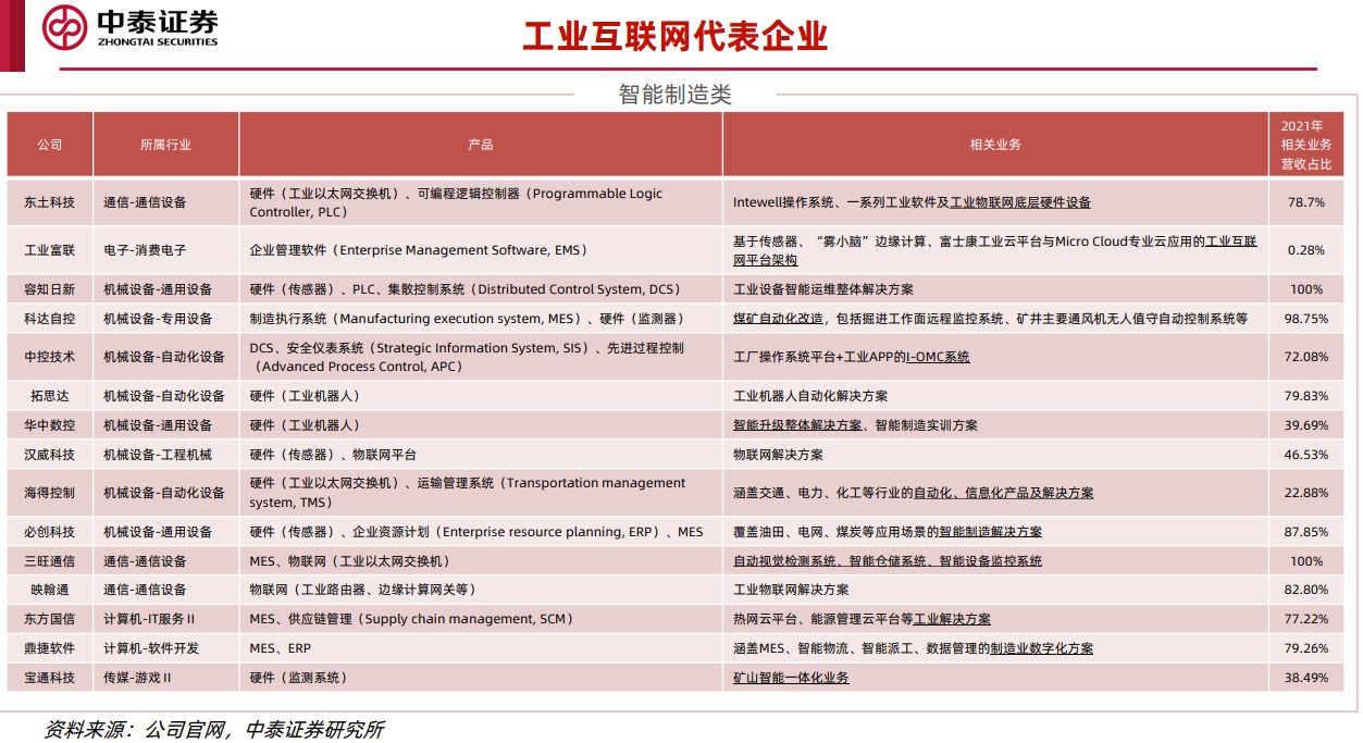 中泰证券将工业互联网中的子行业归为两类,一类聚焦于智能制造、高端制造,通过将产线中的设备数字化,进行状态监控,对可能出现的损耗进行提前预警,同时对于生产工序进行优化,降本增效;另外一类聚焦供应链,为工厂和采购方提供数字化线上采制造购,打通上下游工业品的信息共享、流通、仓储、配送。