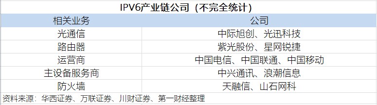 川财证券认为,从网络端到端IPv6渗透率看,运营商网络中无论是接入网、城域网和骨干网等领域,IPv6已经获得全面支持,后续运营商在IPv6改造方面投入景气度仍能维持,而第三方IDC、CDN及云计算基础设施IPv6改造仍有较大提升空间。商业企业路由器、交换机、负载均衡、防火墙等IT设备的持续更新换代需求将持续利好相关上市公司。