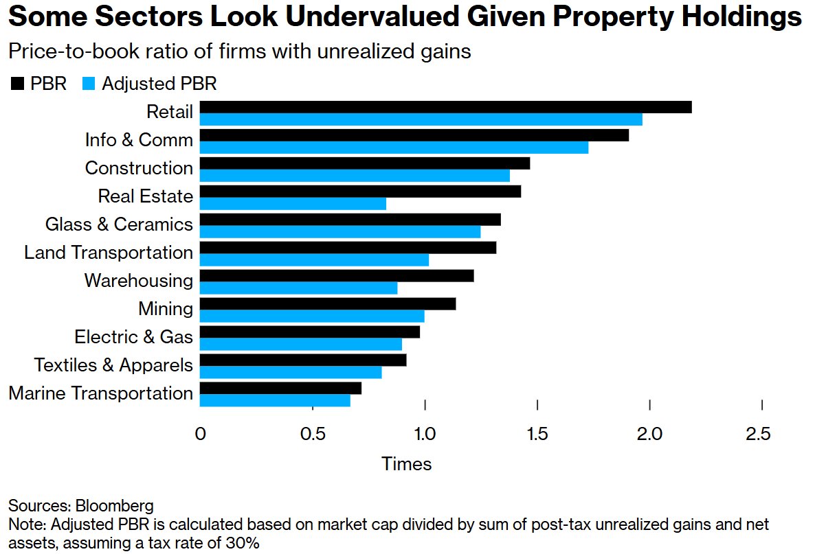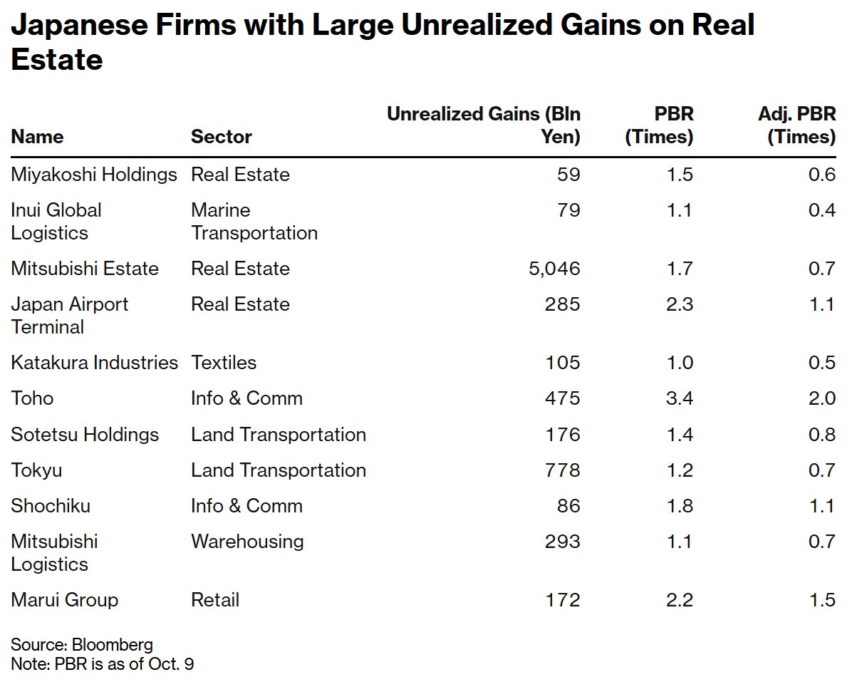 数据显示,至少包括三菱地所和纺织制造商片仓工业在内的七家公司,其持有的房地产未实现收益已超过其市值。