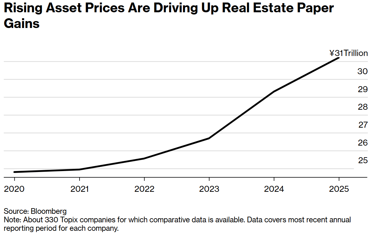 数据显示,由于地价上涨和房地产开发,约330家主要上市公司的此类资产价值已增长至总计31万亿日元(约合2030亿美元)。这比五年前增长了26%,一些策略师预测这一数字还将进一步上升。