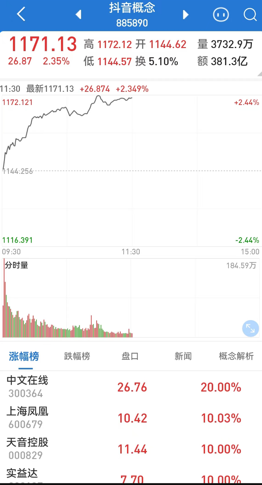 随着“双十一”的临近,抖音概念近来连续11日上涨,今日再度放量上扬逾2%,创近5个月来新高,累计涨逾20%。上海凤凰、天音控股等强势涨停。