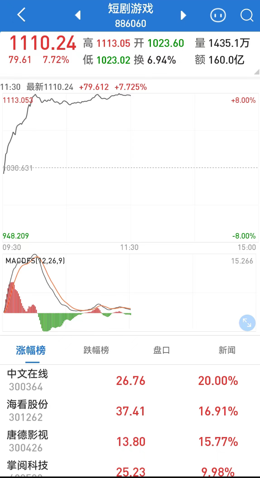 近期爆火的短剧游戏概念早间一度再飙升逾8%。中文在线20%涨停,这已是其3日内第2次涨停,近一周来股价接近翻倍;天威视讯一字涨停,连续第5日封板;龙韵股份同样5连板,半个多月股价亦接近翻倍,唐德影视、掌阅科技等涨停或涨超10%。