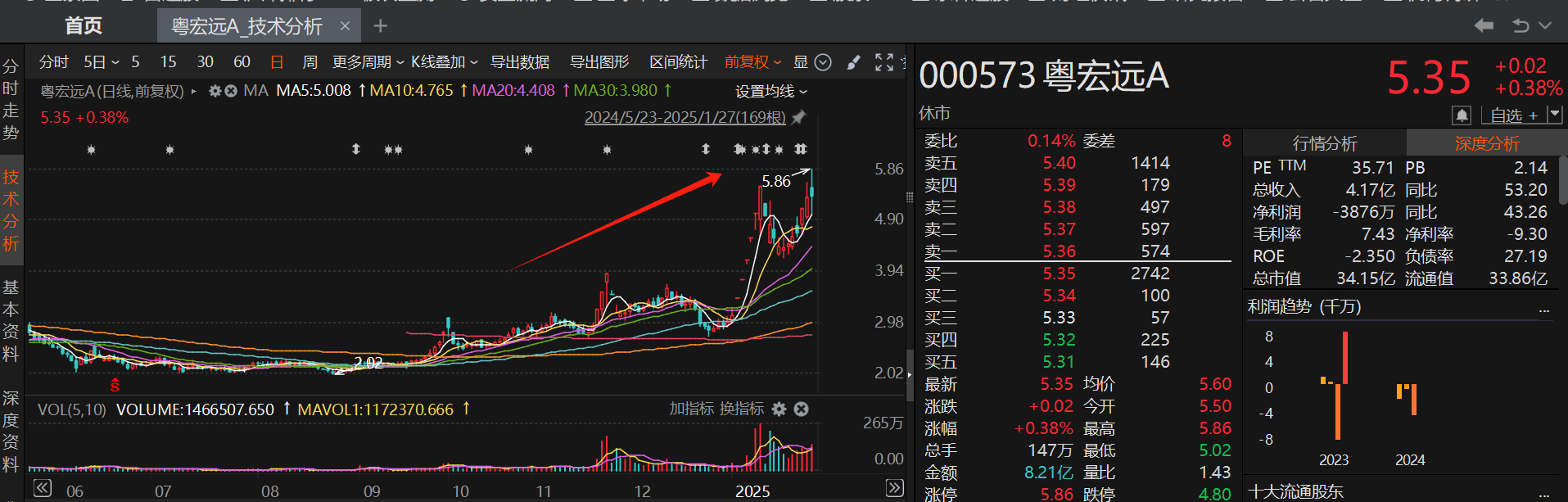主营业务为房地产开发的粤宏远A1月1日迄今股价累计最大涨幅为77.24%。粤宏远A 1月22日公告,已向交易对方支付1.3亿元。早前,粤宏远A 1月2日公告,拟购买博创智能约60%股份,向高端装备制造领域转型。博创智能主要产品为智能注塑成型装备,是加工高分子复合材料的工作母机,属于战略性新兴产业分类的高端装备制造产业。公司目前以房地产开发和销售为主营业务,同时经营再生铅等业务。本次交易围绕战略性新兴产业开展,公司将从传统房地产业务向高端装备制造领域转型,有利于公司寻求新的利润增长点和第二增长曲线,加快向新质生产力转型步伐。