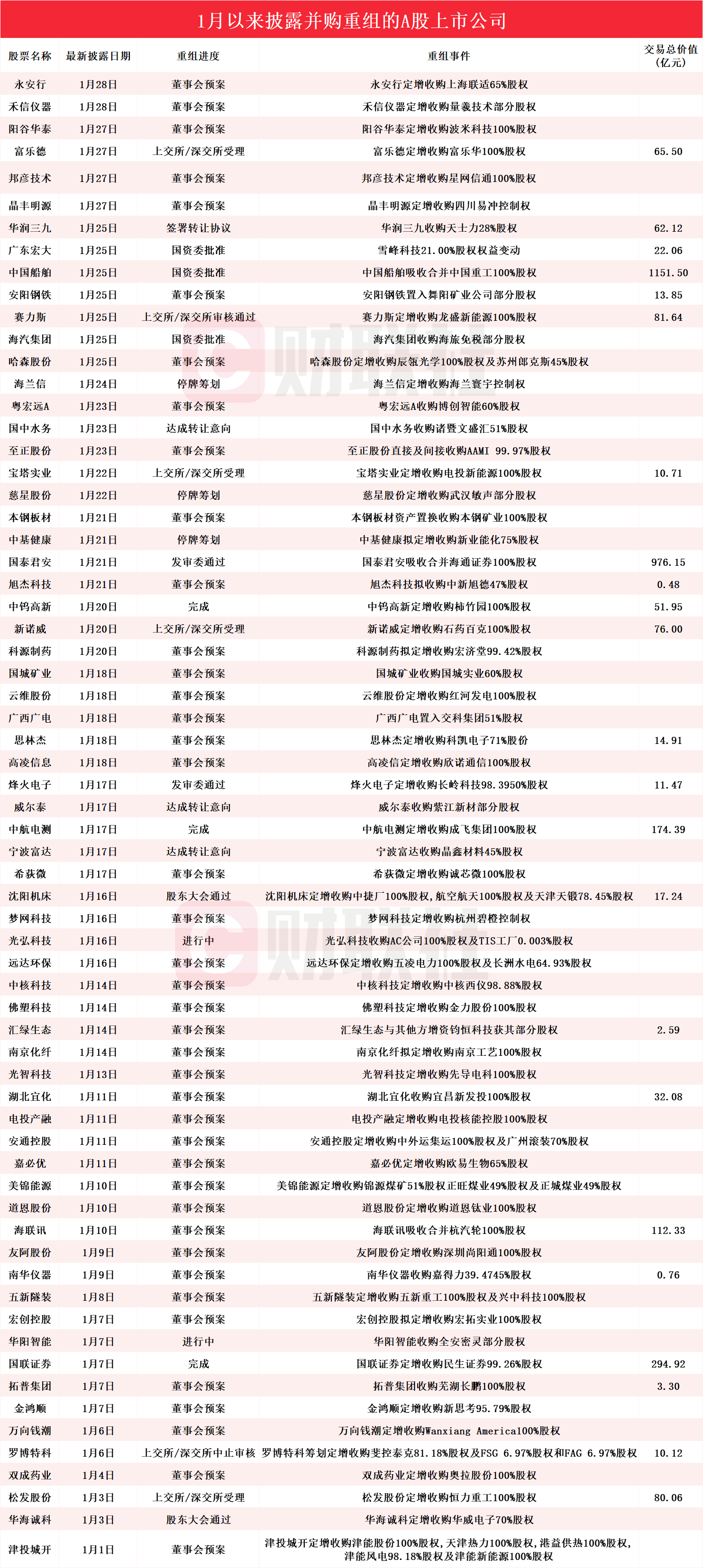 据Wind数据统计,选取参与角色为竞买方,剔除重组失败,1月以来披露并购重组进展的A股上市公司共有66家,分别为永安行、禾信仪器、阳谷华泰、富乐德、邦彦技术、晶丰明源、华润三九、广东宏大、中国船舶、安阳钢铁、赛力斯、海汽集团、哈森股份、海兰信、粤宏远A、国中水务、至正股份、宝塔实业、慈星股份、本钢板材、中基健康、国泰君安、旭杰科技、中钨高新、新诺威、科源制药、国城矿业、云维股份、广西广电、思林杰、高凌信息、烽火电子、威尔泰、中航电测、宁波富达、希荻微、沈阳机床、梦网科技、光弘科技、远达环保、中核科技、佛塑科技、汇绿生态、南京化纤、光智科技、湖北宜化、电投产融、安通控股、嘉必优、美锦能源、道恩股份、海联讯、友阿股份、南华仪器、五新隧装、宏创控股、华阳智能、国联证券、拓普集团、金鸿顺、万向钱潮、罗博特科、双成药业、松发股份、华海诚科和津投城开。具体情况如下图: