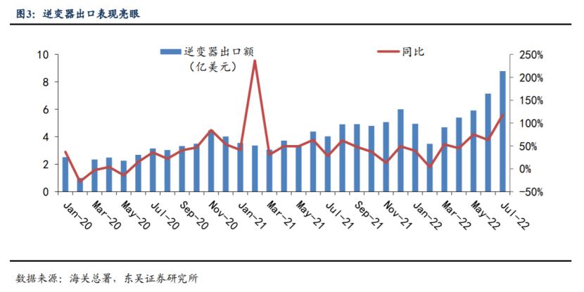 下午,工信部等五部门联合印发加快电力装备绿色低碳创新发展行动计划。推进太阳能等10个领域电力装备绿色低碳发展,研发高电压、高功率、高效散热的逆变器以及智能故障检测、快速定位等关键技术。东吴证券曾朵红等人在8月21日发布的研报中表示,7月逆变器出口金额环增23%,超市场预期。