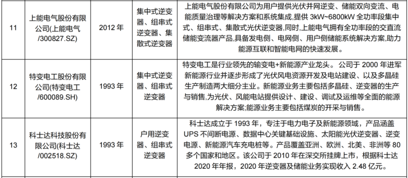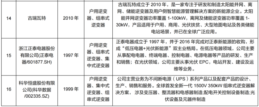 国内逆变器企业中,阳光电源布局户用组串式逆变器、大型组串式逆变器、集中式逆变器、集散式逆变器;上能电气布局大型组串式逆变器、集中式逆变器、集散式逆变器;特变电工布局大型组串式逆变器、集中式逆变器;固德威布局户用组串式逆变器、大型组串式逆变器;锦浪科技布局户用组串式逆变器、大型组串式逆变器;禾迈股份和昱能科技布局微型逆变器。