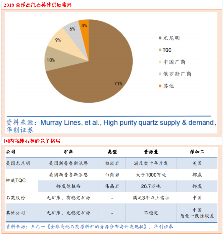 供给端三家主要公司。美国尤尼明公司:成立于1970年,隶属于SibelcoGroup集团,全球高纯石英砂生产商龙头,市场份额具有垄断优势。原料来自SprucePine地区的花岗质伟晶岩。