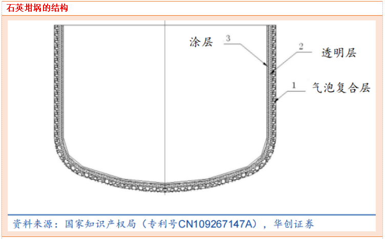 光伏石英坩埚是硅片生产中的重要耗材,对硅片产量和品质有重要影响。石英坩埚主要用于盛装熔融的硅液,是拉晶的关键耗材。石英坩埚为半透明状,有三层结构,即涂层、气泡空乏层、气泡复合层。