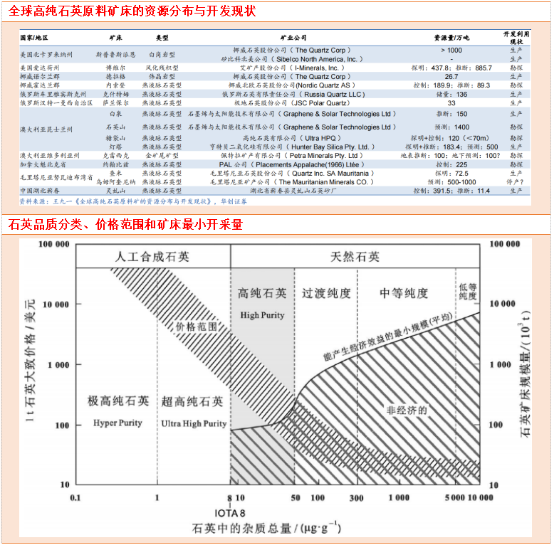 高纯石英矿床资源分布高度集中,杂质含量及赋存状态决定成矿潜力,只有极少部分矿床具有商业价值。美国斯普鲁斯派恩(SprucePine)矿床,具有规模大、流体杂质少、品质稳定等优点,供给了全球90%以上的高纯石英砂。