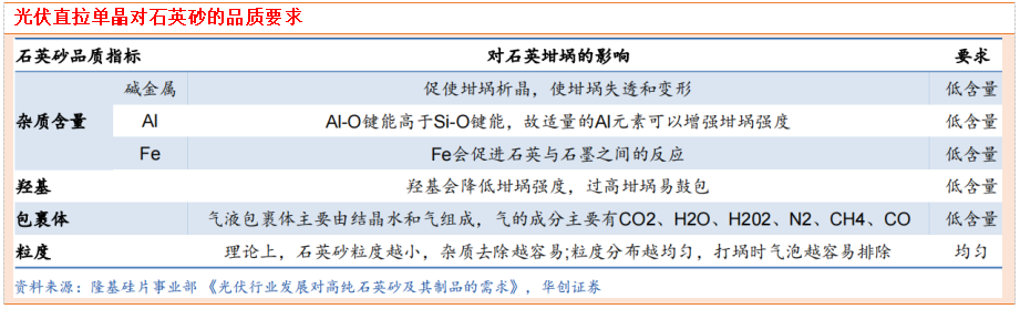 光伏级石英砂主要用于制造石英坩埚,直接影响硅的成晶(整棒率、成晶率、加热时间、直接加工成本等)以及单晶硅的质量(穿孔片、黑芯片等),对石英砂杂质、羟基、包裹体含量,以及粒度分布要求严苛。