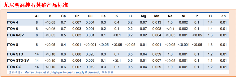 高纯石英砂没有统一划分标准,产业对标美国尤尼明产品。目前高纯石英没有统一的划分标准,国内一般认为标准为(SiO2)≥3-5N、(Fe2O3)<10ppm;海外一般认为9种杂质元素Na、K、Li、Al、Ca、Fe、Ti、B、P的含量总和应<50ppm,且每个杂质元素含量有上限。