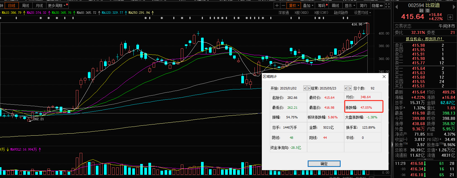 今日比亚迪A股、H股双双走强,股价同步再创新高。截至午间收盘,比亚迪A股报收415.64元/股,涨4.22%,市值达1.26万亿元;H股报收474.2港元/股,涨3.95%,创历史新高。而今年初以来,比亚迪A股、H股累计涨幅分别达47.05%、77.87%。