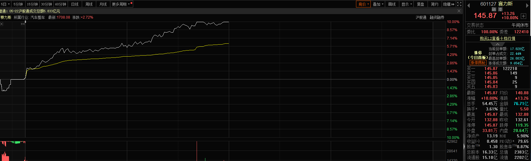 比亚迪大涨也带起了汽车板块,截至午间收盘,赛力斯涨停,股价报收145.87元/股,市值为2383亿元,成交额为76.71亿元。汉马科技涨停,江淮汽车、北汽蓝谷、东风股份、海马汽车、安凯客车、长安汽车、中通客车等跟涨。