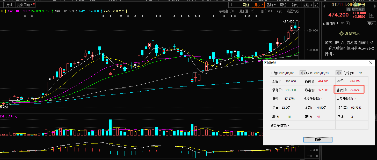 比亚迪作为知名大白马,曾因巴菲特重仓而为大家所知。不过,巴菲特已减仓比亚迪港股,平均减持价格在250港元/股左右,明显低于现价,虽然已赚取几十倍利润,但仍踏空了近一倍涨幅。