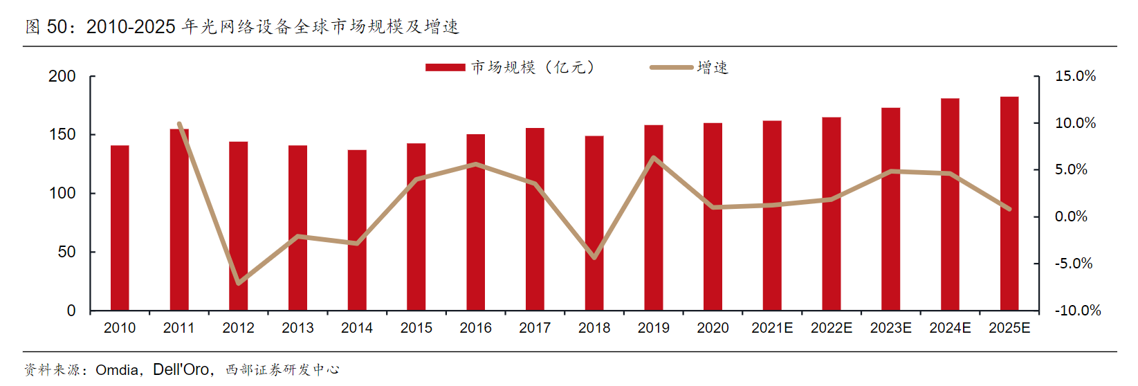 根据Dell'Oro预测,未来几年光传输市场仍将保持积极增长势头,2025年光传输市场规模将达180亿美元,2020-2025年5年CAGR为2.4%。