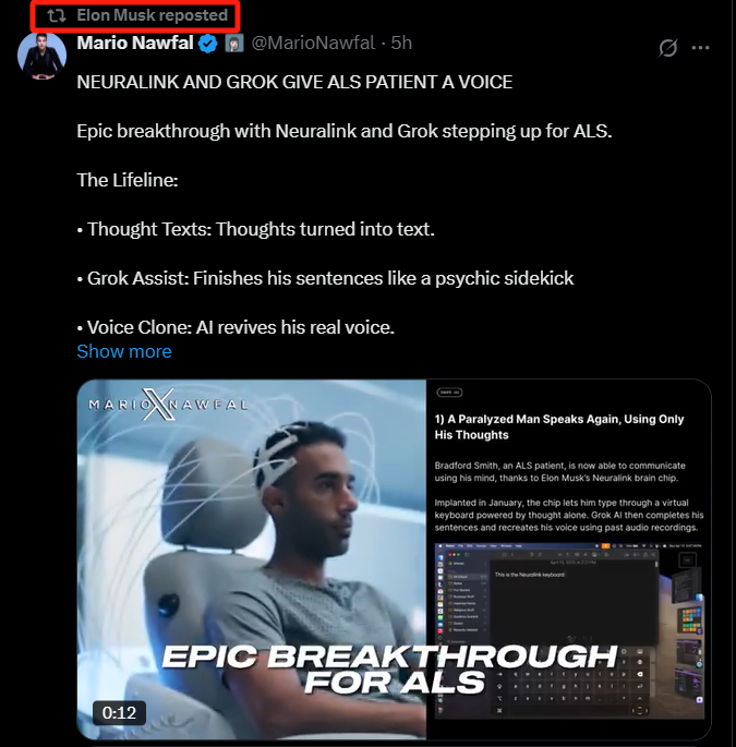 今日,埃隆・马斯克在X上转发的一则案例显示:其旗下脑机接口公司Neuralink正利用人工智能公司xAI的技术,帮助一名渐冻症患者重新“说话”。