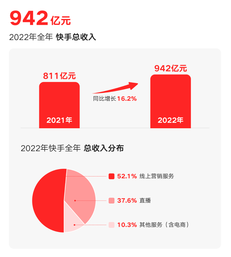 财报显示,2022年,快手年度总营收达942亿元,同比增长16.2%,超越彭博市场一致预期的931亿元。