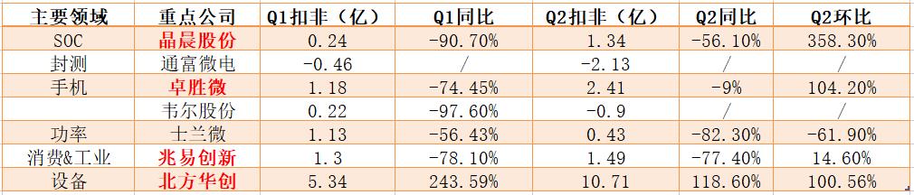 总体上,从各细分领域龙头公司已公布的中报业绩预告来看,在经济低迷以及行业自身景气周期触底阶段,预报有惊喜的仅有半导体设备领域,其余领域如设计领域,受制于库存去化,中报业绩同比来看依然大幅下滑,不过环比来看略有改善;封测领域受制于下游需求复苏不及预期,业务承压。功率半导体领域,在行业景气下行期表现相对稳定,二季度营收有明显改善。上半年行业内个股业绩大面积同比下滑,但大多数环比业绩呈改善状态,三季度业绩有望继续改善。