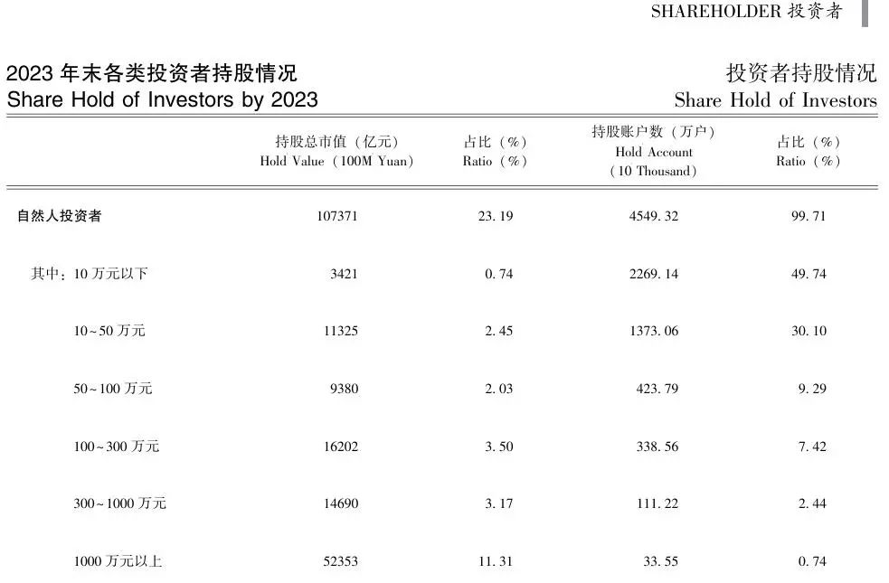 实际上,根据《上交所年鉴2024》,在2023年底,直接持有上交所股票的自然人账户中,100万—300万元共有338.56万人,300万—1000万元共有111.22万人,1000万元以上共有33.55万人。三项合计共有483.33万人。