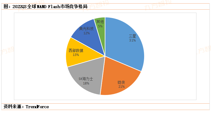 据TrendForce集邦咨询2022年11月23日研究显示,截止2022年第三季度,在NAND闪存市场,三星的市场份额为31.4%,排行第一;其次是铠侠20.6%;后面是SK海力士18.5%,西部数据12.6%,美光12.3%。