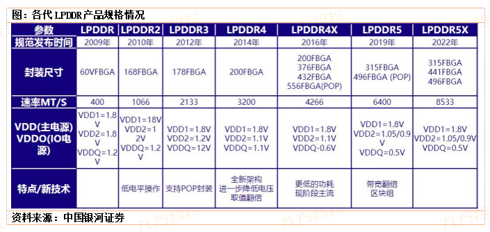 LPDDR:低功耗双数据速率同步动态随机存取内存的缩写,经历了多个版本的发展,2006年LPDDR1代版本首次推出,主要用于早期移动设备,提供低功耗和高性能存储产品,后续不断迭代,电压逐步降低,频率稳步提升。