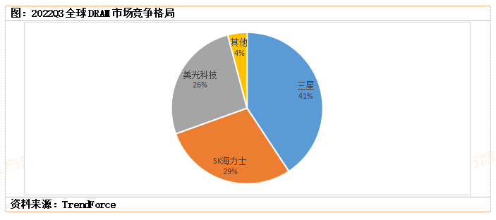 据TrendForce集邦咨询2022年11月16日研究显示,截止2022年第三季度,在DRAM市场中,三星份额为40.7%,仍占据全球第一,SK海力士为28.8%,排位第二,美光为26.4%,居第三,剩余份额由南亚、华邦等厂商占据。