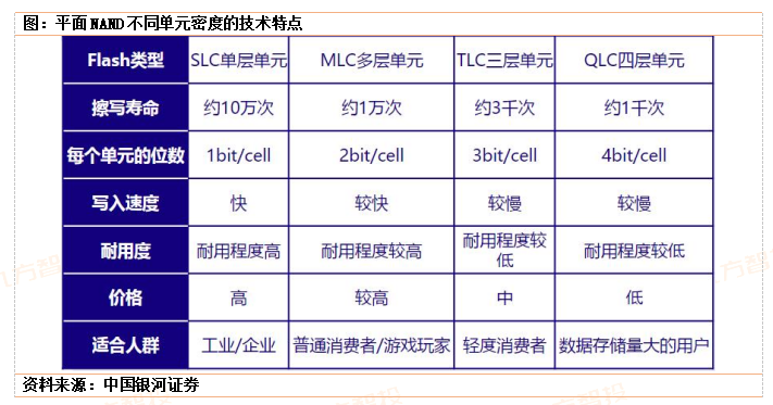 NANDFlash从存储单元上可以分为以下几类,分别为平面的SLC/MLC/TLC/QLCNAND和立体的3DNAND,其中平面四类每个单元存储信息依次递增,电压变化随存储信息增多成指数级增长,但寿命也随之减少。SLC产品凭借高可靠性的擦除、高带宽、寿命长等优势在IoT领域广泛应用,SLC也是向大容量NAND拓展的必经之路。TLC和QLC产品为目前大容量存储主流。