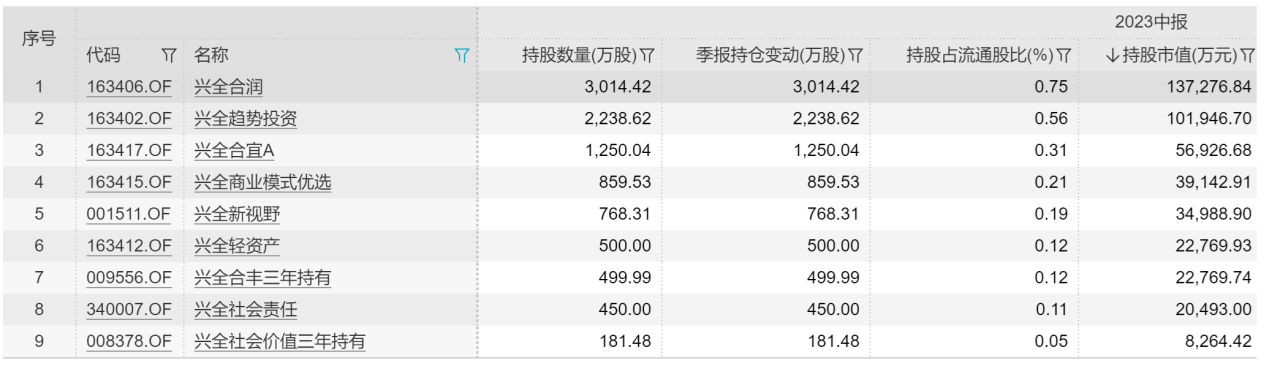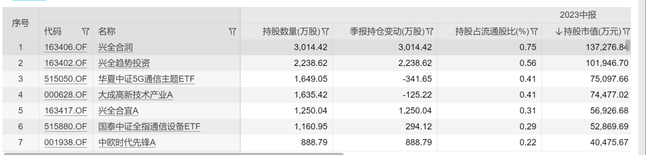 具体来看,持仓最多的基金是由谢治宇、叶峰所管理的兴全合润,持股数量是3014.42万股,其次是董理、谢治宇管理的兴全趋势投资,持有2238.62万股。华夏中证5G通信主题ETF则持有1649.05万股。