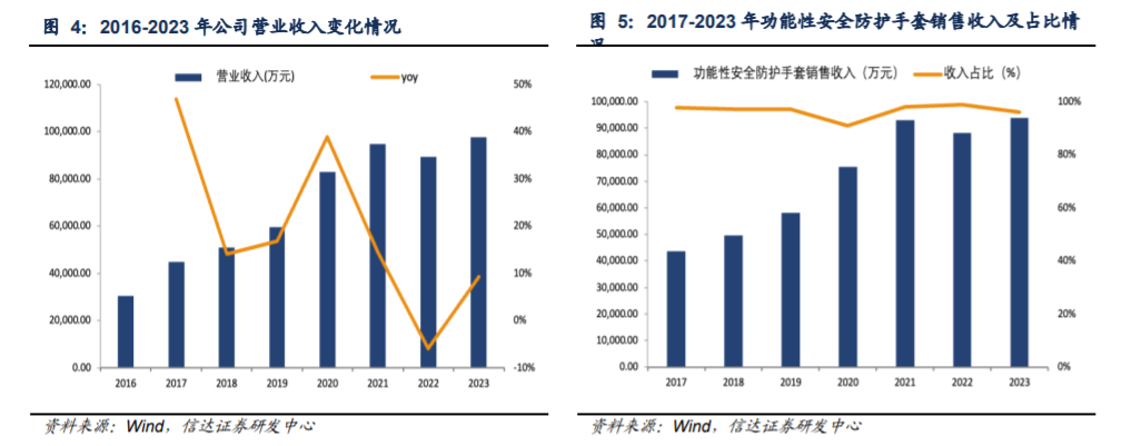 多年深耕功能性安防手套,确立行业领先地位。公司成立于2004年,目前主要从事安防用品和高分子新材料生产和销售,销售渠道以直销为主,产品销售涵盖境内外市场,经营产品包括功能性安全防护手套、超高分子量聚乙烯纤维材料等。2023年公司实现营业收入9.77亿元,同比增长9.39%,其中功能性安全防护手套营业收入9.40亿元,推动公司收入持续增长。2023年公司实现归母净利润1.06亿元,同比下降13.05%,主要受产品结构调整等因素影响。