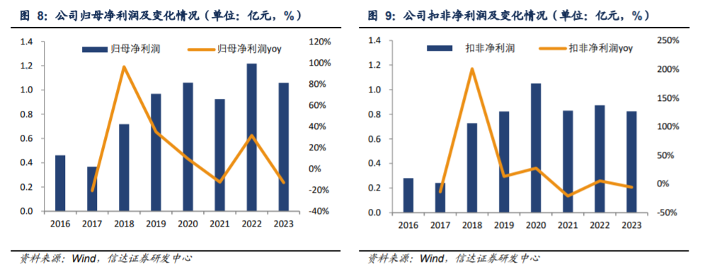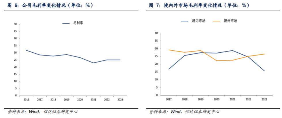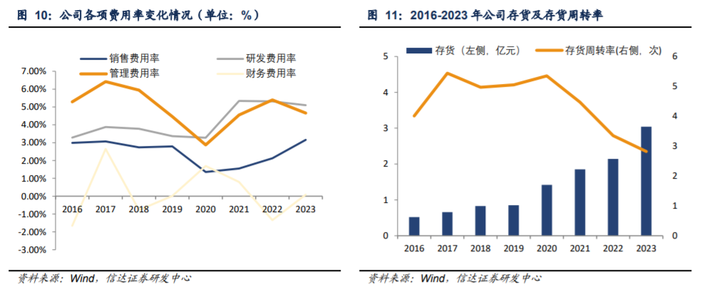 分区域来看,公司当前销售市场结构以外销为主,同时正在逐步拓展境内市场。2023年公司在境外、境内市场销售收入为8.54亿元、1.23亿元,同增4.45%、62.84%,收入占比分别为87.41%、12.59%。