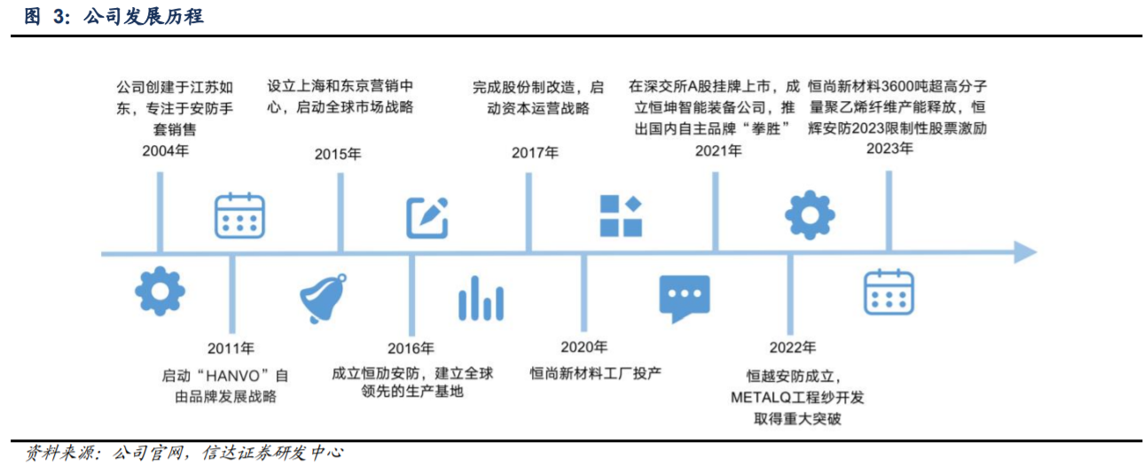 2004年公司创始人王咸华先生在江苏如东创立恒辉手套厂,专注于安防手套的生产和销售。2007年公司手套产量突破300万打,其中98%出口欧美和日本市场。2009年公司新建生产基地并拓宽产品线,随后在2011年启动“HANVO”品牌形象,打造自有品牌发展战略。