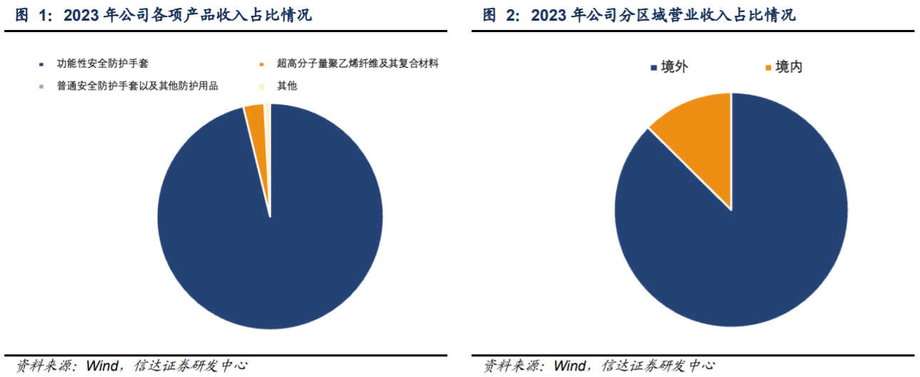 分业务来看,公司以功能性安全防护手套为主要产品,同时生产少量普通安全防护手套及其他防护产品。当前公司正在逐步拓展超高分子量聚乙烯纤维及其复合材料业务。2023年公司功能性安全防护手套、超高分子量聚乙烯纤维及其复合材料、普通安全防护手套及其他防护产品以及其他产品销售收入分别占比96.19%、3.00%、0.12%、0.70%。
