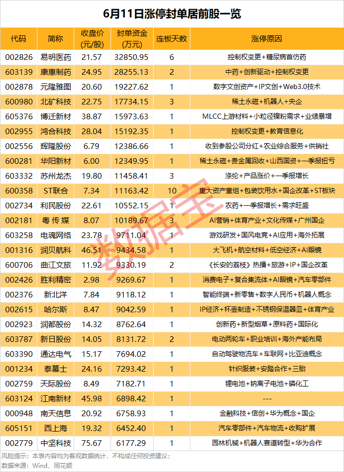 以封单金额计算,12股封单资金超1亿元,易明医药、康惠制药、元隆雅图封单资金居前,分别为3.29亿元、2.83亿元、1.92亿元。