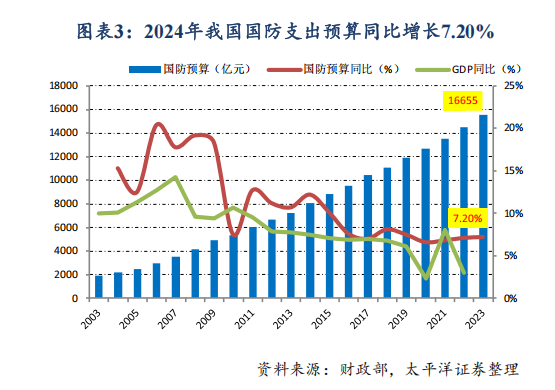 我国2024年国防支出预算16655.40亿元,同比增长7.20%,高于5%的GDP增速,占比1.5%。对比美国军费占GDP的比重大于3%,北约成员国中有23个国家比重超过2%,日本将在 2027 年前提高至 2%以上。虽然军费使用效率上我国有优势,但在“百年未有之大变局”及强军目标下,军费依然有较大的提升空间。