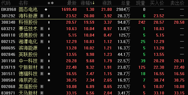 6月20日早盘,A股固态电池板块多股走高,海科新源、诺德股份、湘潭电化等个股涨停,科恒股份盘中涨停,午间收盘上涨19.59%,中一科技、德福科技、上海洗霸等涨幅在5%以上。