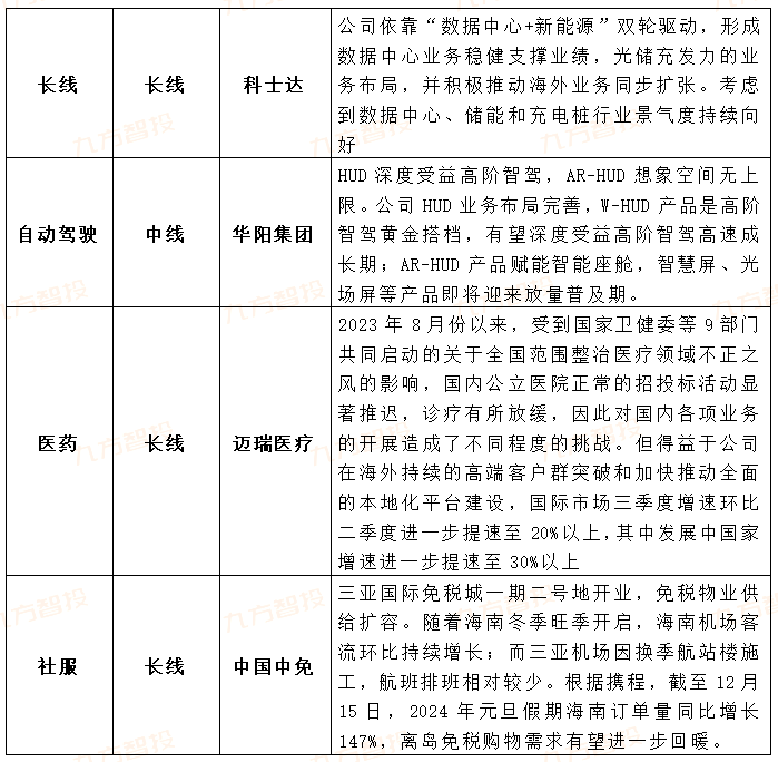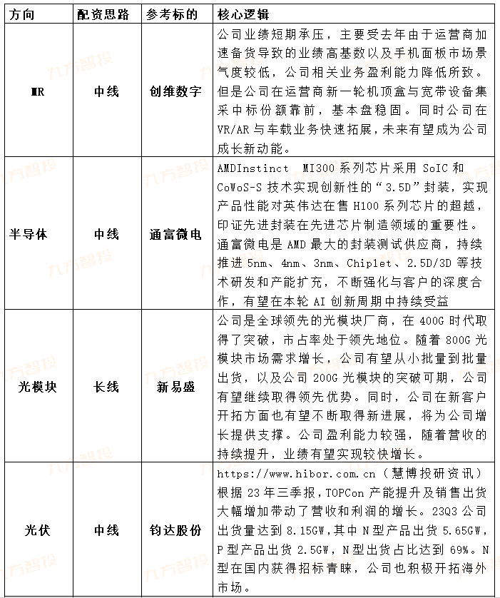 综上来看,经济有望逐步筑底,主要宽基指数估值接近近3年底部水平,年末岁初机构调仓之后,预计市场底有望逐步出现;年初虽为大部分行业淡季,但科技等相关行业产业趋势已经出现,Q1相关催化性事件较多,且预计一季度业绩也有望予以兑现;海外整体通胀低于预期,预计Q2美国有望开启降息周期,全球权益资产估值中枢有望重新得到修复,内外共振下,指数有望震荡强修复,关注方向如下: