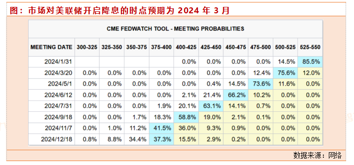 从分母端来看,流动性持续宽松,海外方面,海外通胀回落,CPI同比为3.1%,虽然部分有基数效应的原因,但已有6个月落入2~3.8%这一历史正常区间。若往后环比不超过0.3%,则同比将稳定在这一区间内,降息进入美联储视野,市场已计入美联储2024年3月降息、全年降息150BP预期。