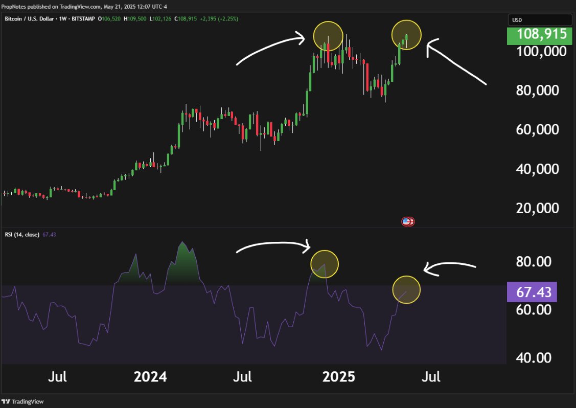 更重要的是,RSI有可能正在形成看跌背离的苗头:即比特币价格在不断创出新高的同时,RSI却未能同步创高,反而略低于之前的峰值。这种价强指标弱的背离现象往往预示上涨动能减弱,值得投资者提高警惕。历史上,RSI的背离经常先于价格见顶出现,是一个典型的领先指标。因此,目前RSI传递的是一个“谨慎乐观”的信号——虽不至于立即翻转看空,但提醒我们不要过度乐观。