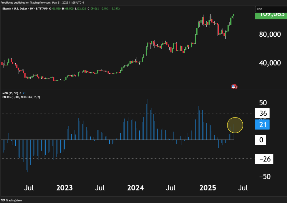 自定义的均值偏离检测器(Mean Deviation Detector)能够衡量比特币价格相对于历史均值的偏离程度。该指标当前的读数表明,即使经过了这一轮大幅上涨,比特币距离出现历史极端值仍有一定空间。换句话说,比特币尚未达到以往周期中所见的极端超买水平。