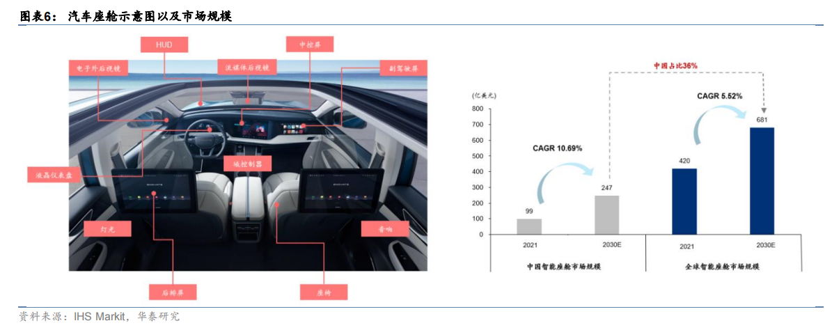 IHS预测国内智能座舱市场增速领先全球,国内规模从2021年99亿美元预计提升至2030年247亿美元,2022-2030年CAGR为10.69%,我国智能座舱规模全球占比将从2021年24%左右上升到2030年的36%。