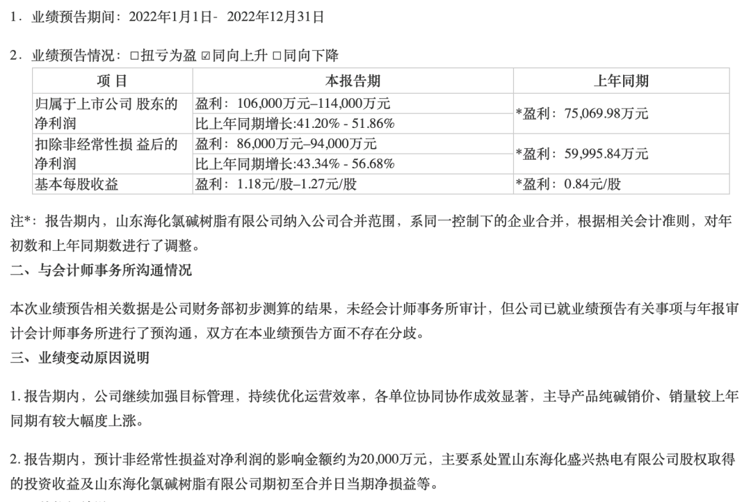 受益于2022年纯碱产品价格、销量同比上升,双环科技、山东海化均预告2022年盈利水平增长。